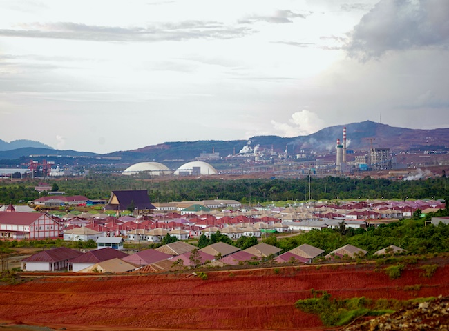 The Harita High Pressure Acid Leaching (HPAL) plant on Obi Island. Red soil in foreground is laterite (Photo: JATAM/ Rifki Anwar)